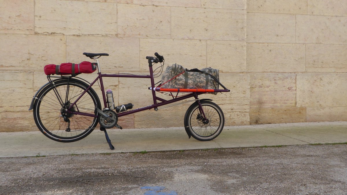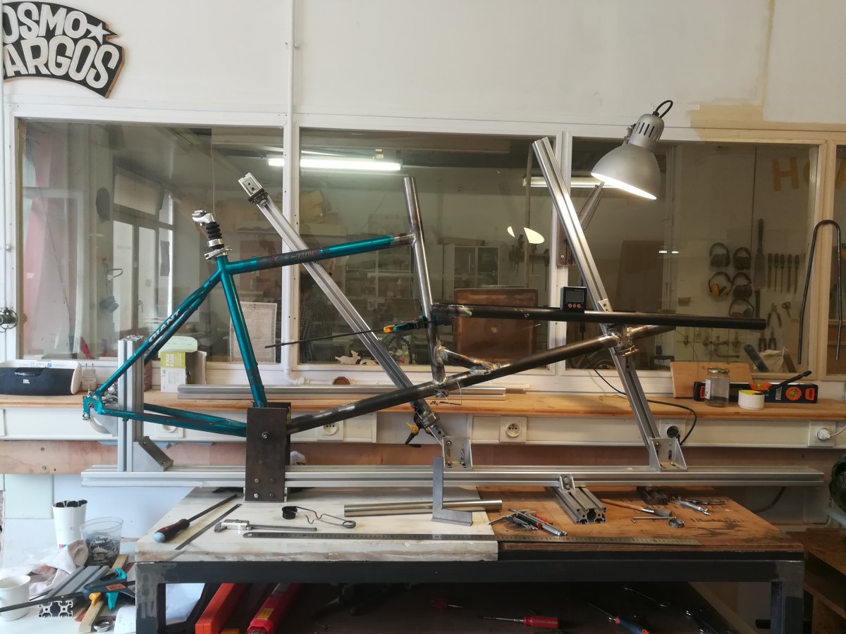 La partie avant (la plateforme, le tube diagonal et les deux tubes de direction) est faite avec un mélange de tubes neufs (les grandes longueurs sont difficiles à trouver en réemploi) et de tubes de réemplois découpés sur des vieux vélos.